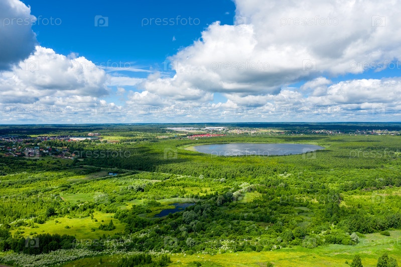 Вид с воздуха на сельскую местность и озеро посреди леса