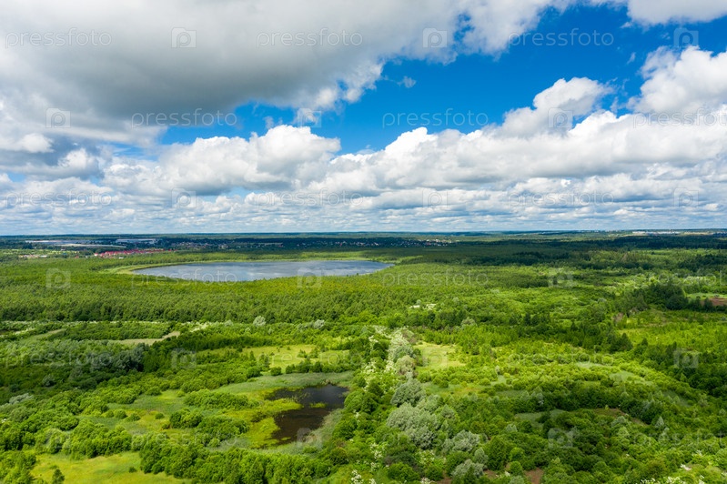Вид с воздуха на сельскую местность и озеро посреди леса