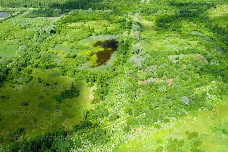 Вид с воздуха на сельскую местность и озеро посреди леса