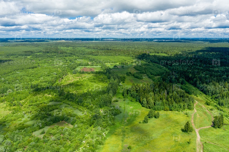 Вид с воздуха на проселочную дорогу через поля и леса