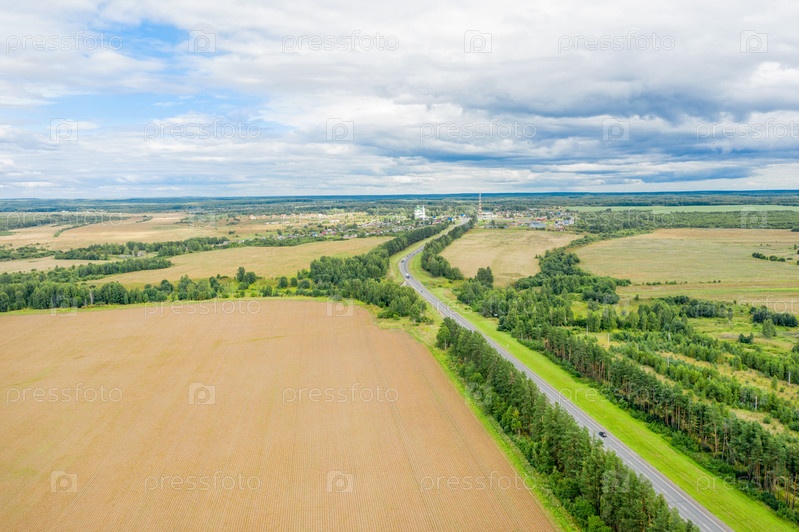 Вид с воздуха на убранные сельскохозяйственные поля и шоссе в осенний день