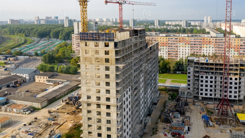 Строятся новые высотные многоквартирные дома. Аэрофотоснимок солнечным вечером