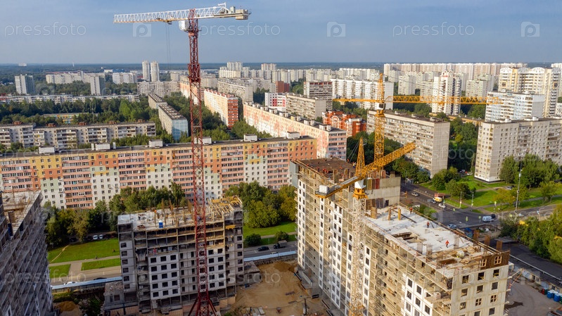 Строятся новые высотные многоквартирные дома. Аэрофотоснимок солнечным вечером