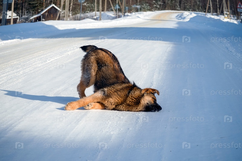 Дворняга играет с камешком в солнечный зимний день