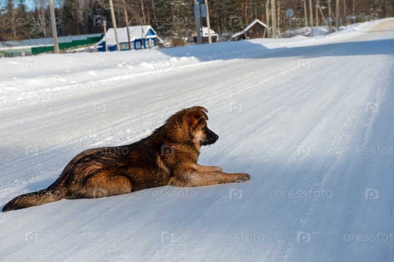 Дворняга на прогулке в солнечный зимний день