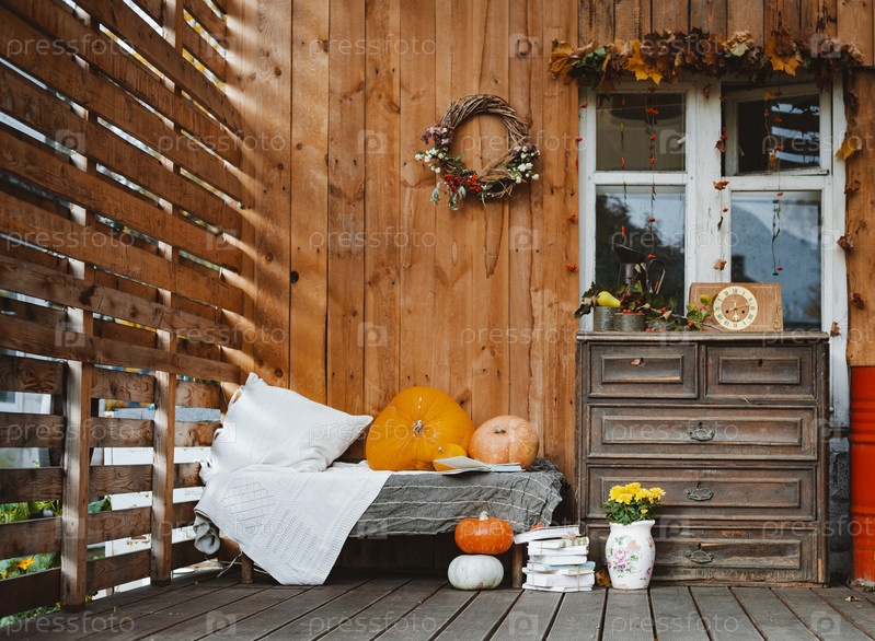 Декоративное дизайнерское окно на террасе. осенний венок и тыквы винтажный старый комод на деревянном деревенском фоне. осенняя композиция и зона отдыха