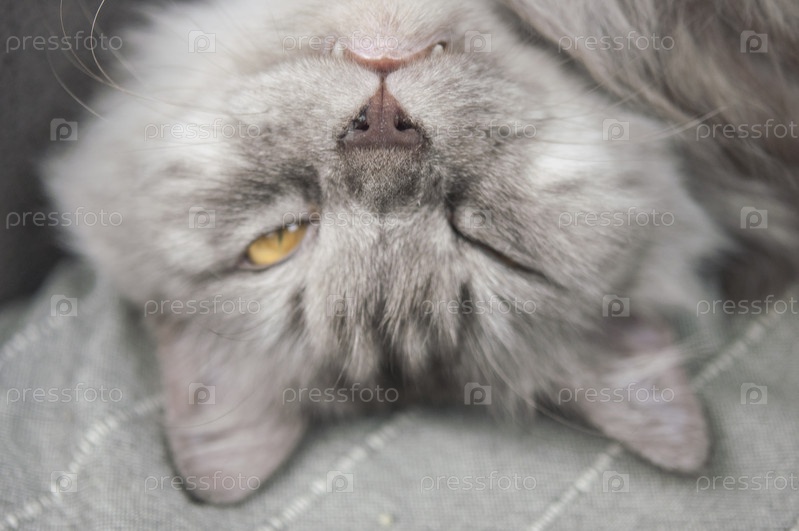 Длинношерстный серый кот спит на диване в домашней обстановке