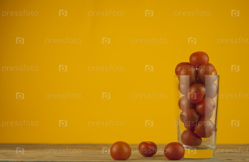 Маленькие красные помидоры черри в прозрачной стеклянной чашке на фоне деревянного стола. красные овощи