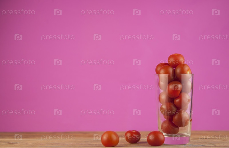 Маленькие красные помидоры черри в прозрачной стеклянной чашке на фоне деревянного стола. красные овощи