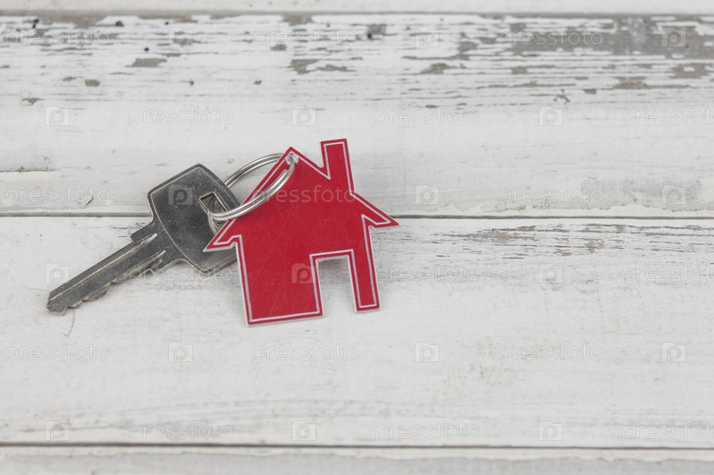 Расположение брелка в форме ключа и дома на фоне старого белого дерева. Вид сверху, плоская планировка. Недвижимость, концепция страхования, ипотека, покупка дома, концепция риэлтора