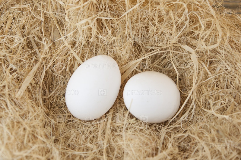 Белые яйца, положенные на кучу соломы. В яйцах содержатся витамины, фосфор, цинк