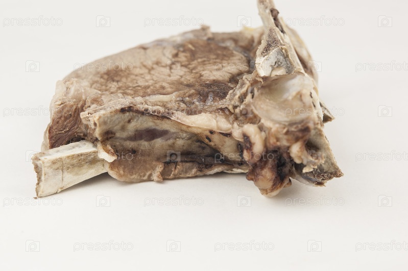 Кусок вареной говядины с костью на белом фоне