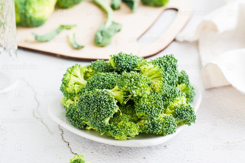 Кусочки сырой брокколи на тарелке на светлом столе. Крупный план