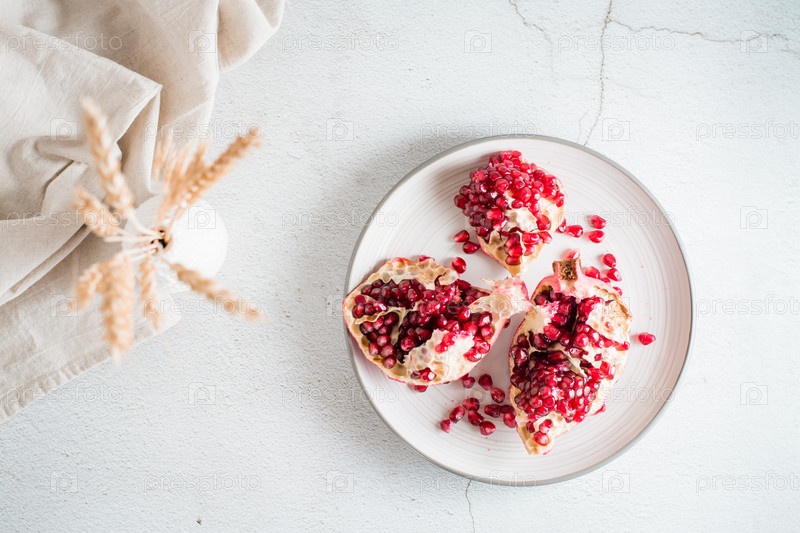 Целый спелый гранат, разделенный на кусочки на тарелке на светлом столе. Органическая натуральная пища. Образ жизни. Вертикальный вид. Вид сверху