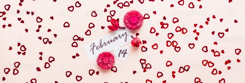 День Святого Валентина. Дата 14 февраля и сухие цветы на розовом фоне, усыпанном сердечками. Вид сверху. Веб-баннер
