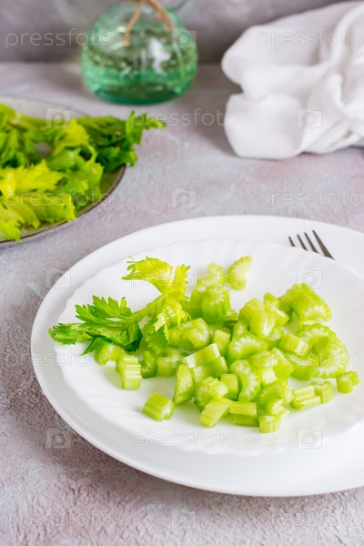 Диетический салат из свежего нарезанного сельдерея на тарелках на столе. Вегетарианская пища. Вертикальный вид