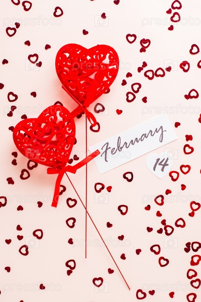 День Святого Валентина. Дата 14 февраля и два фигурных красных сердца на розовом фоне, усыпанном сердечками. Вертикальный и вид сверху