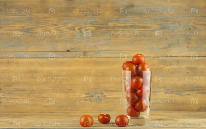 Маленькие красные помидоры черри в прозрачной стеклянной чашке на фоне деревянного стола. красные овощи
