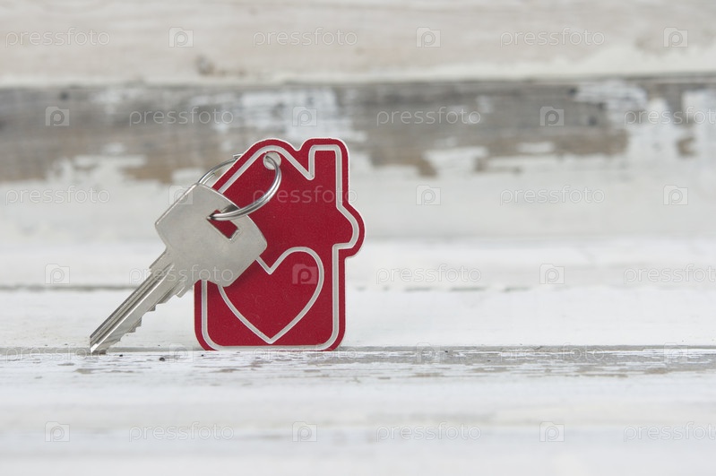 Расположение брелка в форме ключа и дома на фоне старого белого дерева. Вид сверху, плоская планировка. Недвижимость, концепция страхования, ипотека, покупка дома, концепция риэлтора