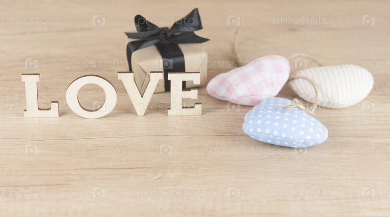 Слово любовь из деревянных букв с красочными сердцами ткани на фоне дерева. С днем Святого Валентина
