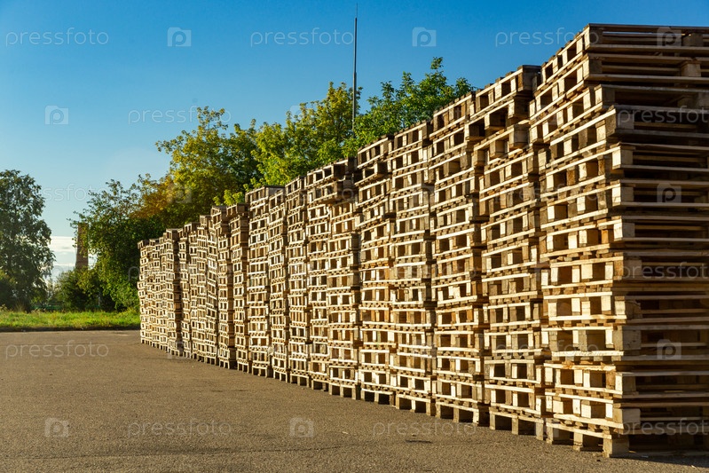 Стопки деревянных поддонов на складском дворе завода