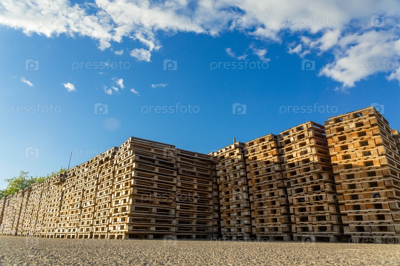 Стопки деревянных поддонов на складском дворе завода. Поддоны для перевозки грузов в транспортной компании
