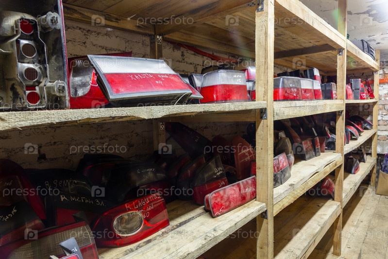 Подержанные автозапчасти на стеллажах магазина. Подержанные автозапчасти для продажи в магазине на свалке. Задние фонари для разных автомобилей. Разборка автомобилей