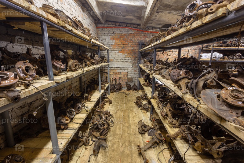 Подержанные автозапчасти на заводской полке. Подержанные автозапчасти для продажи в магазине на свалке. Поворотный кулак, рычаги автомобилей. Разборка автомобилей