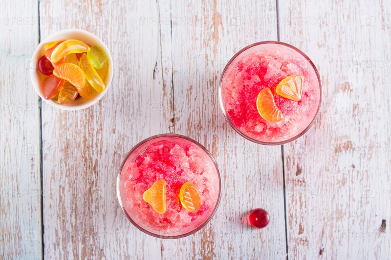 Сладкая домашняя стружка льда с сиропом и мармеладом в стаканах на столе. Вид сверху