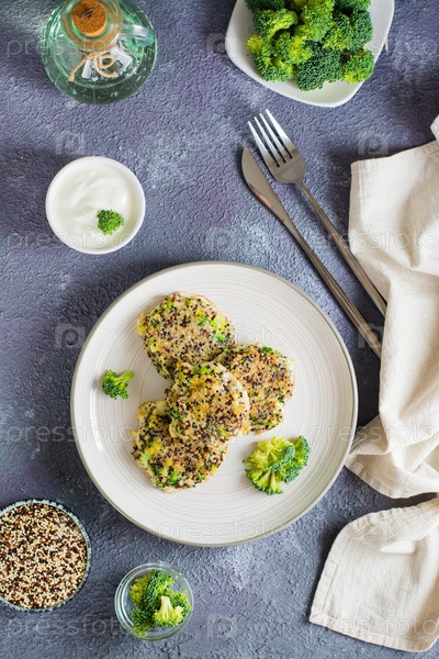 Жареные блины из киноа и брокколи на тарелке. Верхний и вертикальный вид