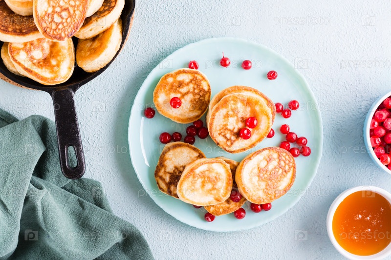 Готовы есть блины и клюкву на тарелке и миску меда на столе. Домашний десерт на завтрак. Вид сверху
