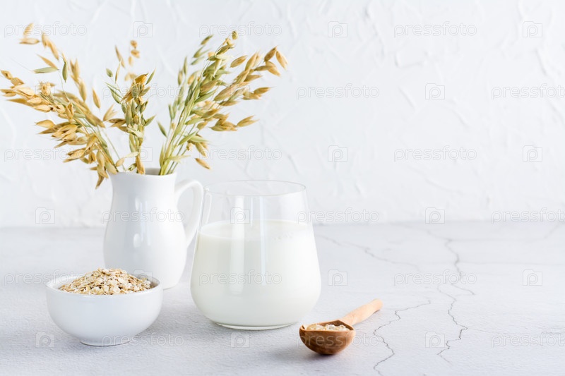 Овсяное молоко в стакане, овсянка в миске и уши в кувшине на светлом столе. Альтернативная растительная пища