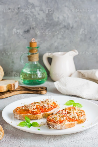 Аппетитный бутерброд с вялеными помидорами и ростками клевера и люцерны на тарелке на столе. Диетическое органическое питание. Вертикальный вид