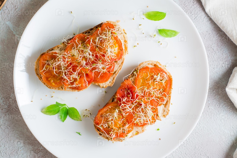 Аппетитный бутерброд с сушеными помидорами и ростками клевера и люцерны на тарелке на столе. Диетическое органическое питание. Крупный план. Вид сверху