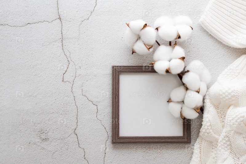 Экологичный домашний шаблон пустой квадратной фоторамки, вязаный свитер и хлопковая ветка на сером фоне. Пастельные тона. Копировать пространство