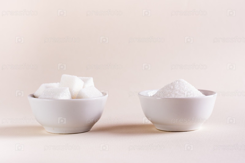 Кубики сахара и сахарный песок в мисках на светлом фоне. Выбор между видами сахара
