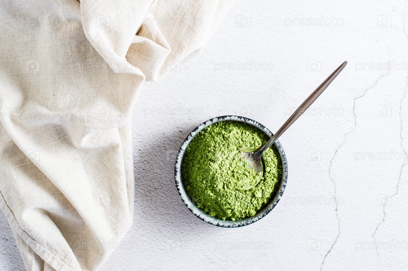 Органический порошок зеленого чая маття в миске и ложка на столе. Вид сверху