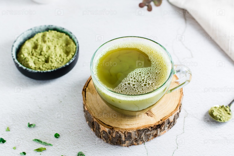 Органический зеленый чай матча в чашке на стволе дерева на столе. Крупный план