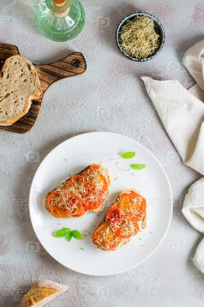 Готовый к употреблению бутерброд с вялеными помидорами и ростками клевера и люцерны на тарелке на столе. Диетическое органическое питание. Верхний и вертикальный вид