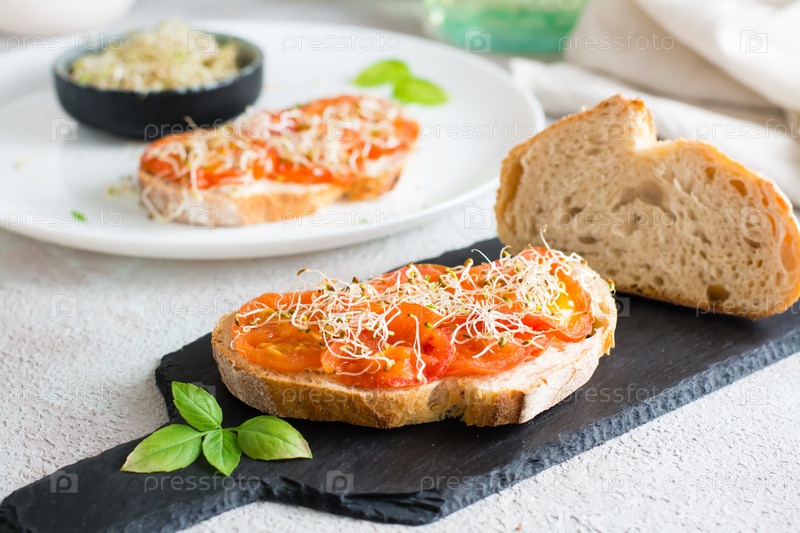 Готовый бутерброд с вялеными помидорами и ростками клевера и люцерны на столе. Диетические органические продукты