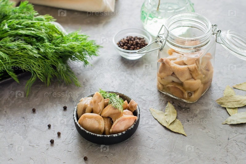 Вкусные маринованные грибы в миске и в стеклянной банке на столе. Вегетарианская органическая пища