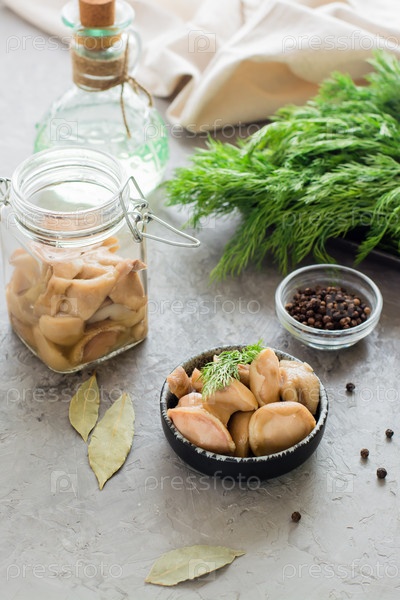 Маринованные грибы - подосиновики в миске и в стеклянной банке на столе. Органическая вегетарианская еда. Вертикальный вид