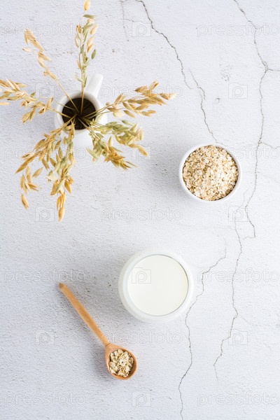 Овсяное молоко в стакане, овсянка в миске и уши в кувшине на светлом столе. Альтернативная растительная пища. Вертикальный вид