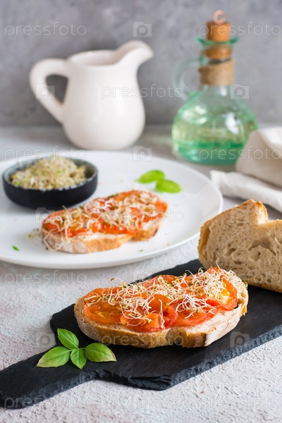 Готовый бутерброд с вялеными помидорами и ростками клевера и люцерны на столе. Диетическое органическое питание. Вертикальный вид