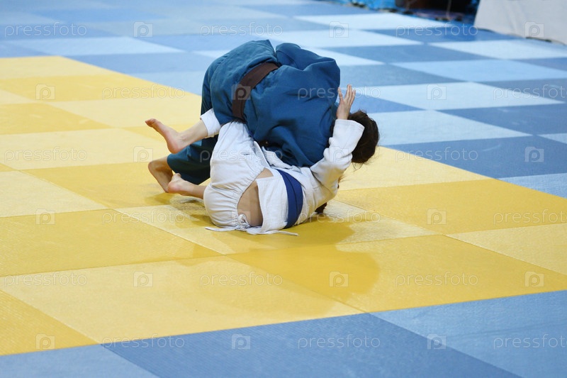 Две девушки-дзюдоистки в кимоно соревнуются на татами