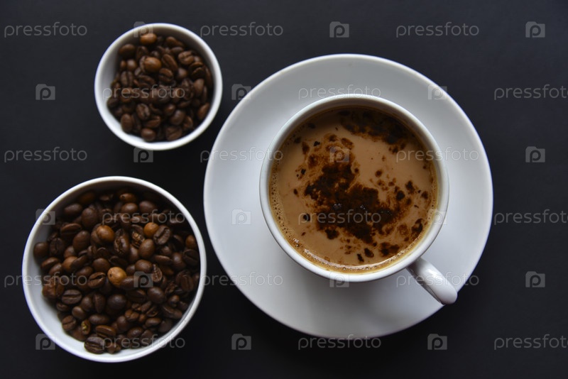 Вкусный кофе в фарфоровой чашке с блюдцем и кофейными зернами. Кофе в чашке и бобы на черном фоне