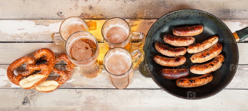 Пивные кружки и стаканы, сковорода с жареными сосисками и мягкие соленые крендельки. Вид сверху