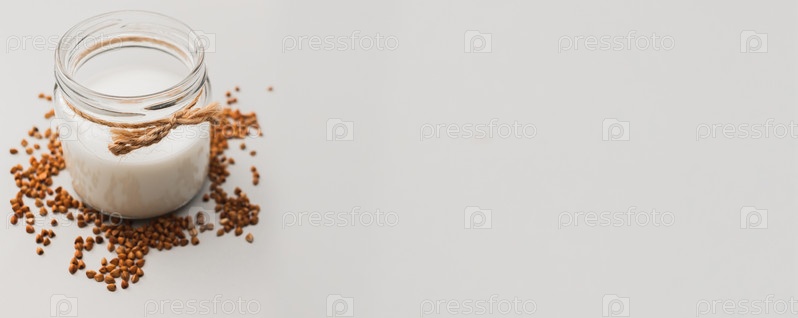 Баночка с веганским молоком и гречкой. Эко- и животноводческая концепция питания. Здоровое питание, диета. Не содержит лактозы. Мягкий фокус. Скопируйте пространство. Баннер