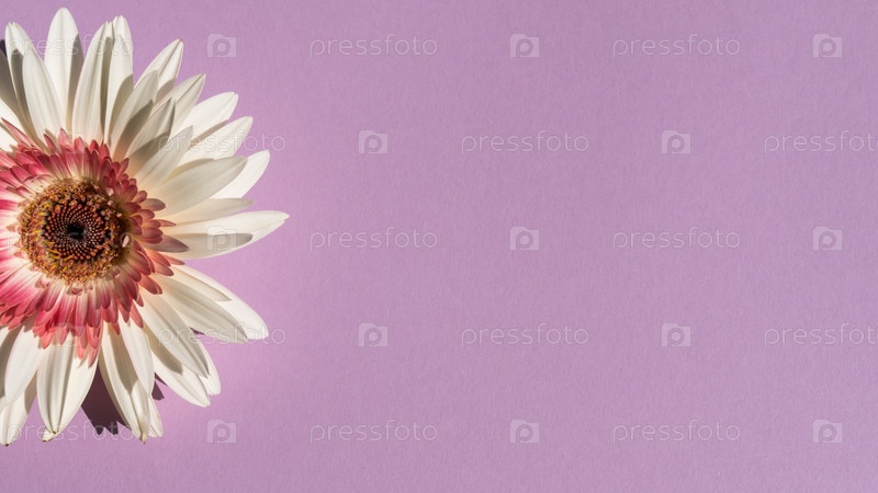 Белая гербера на фиолетовом фоне, плоская планировка, вид сверху