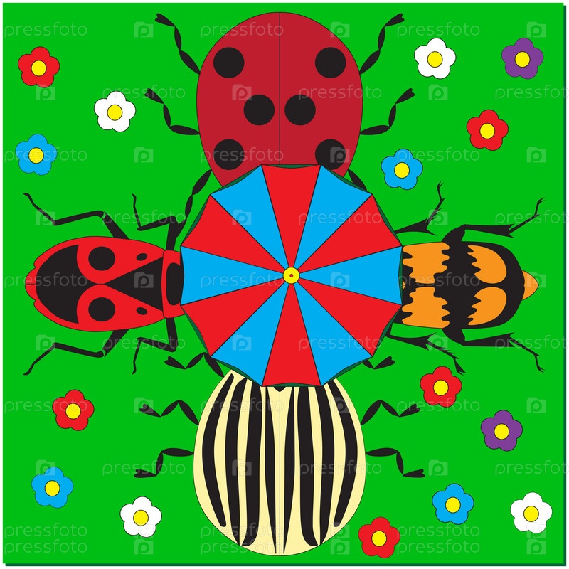Четыре жука на зеленом лугу с цветами встретились под зонтиком